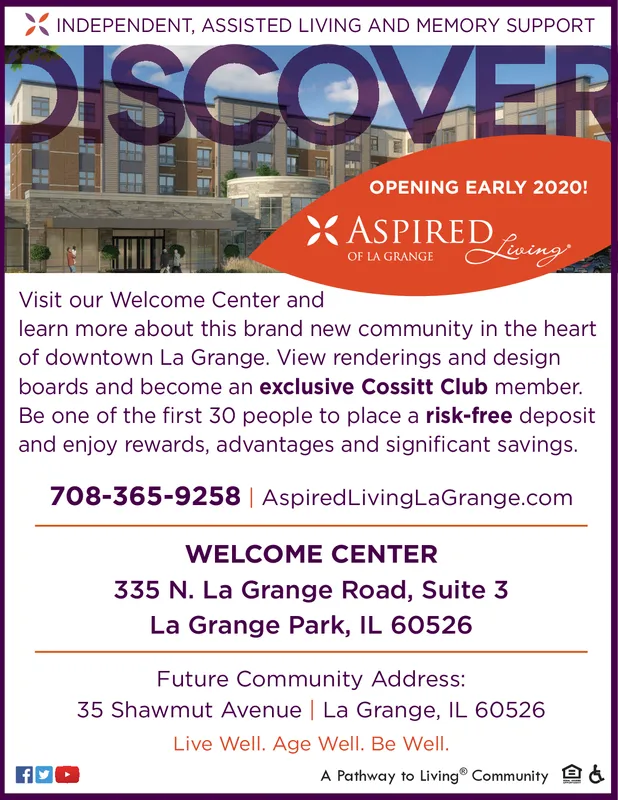 INDEPENDENT, ASSISTED LIVING AND MEMORY SUPPORT DISCOVER OPENING EARLY 2020! XASPIREDing OF LA GRANGE Visit our Welcome Center and learn more about this brand new community in the heart of downtown La Grange. View renderings and design boards and become an exclusive Cossitt Club member. Be one of the first 30 people to place a risk-free deposit and enjoy rewards, advantages and significant savings. 708-365-9258 AspiredLivingLaGrange.com WELCOME CENTER 335 N. La Grange Road, Suite 3 La Grange Park, IL 60526 Future Community Address: 35 Shawmut Avenue | La Grange, IL 60526 Live Well. Age Well. Be Well. Community A Pathway to Living INDEPENDENT, ASSISTED LIVING AND MEMORY SUPPORT DISCOVER OPENING EARLY 2020! XASPIREDing OF LA GRANGE Visit our Welcome Center and learn more about this brand new community in the heart of downtown La Grange. View renderings and design boards and become an exclusive Cossitt Club member. Be one of the first 30 people to place a risk-free deposit and enjoy rewards, advantages and significant savings. 708-365-9258 AspiredLivingLaGrange.com WELCOME CENTER 335 N. La Grange Road, Suite 3 La Grange Park, IL 60526 Future Community Address: 35 Shawmut Avenue | La Grange, IL 60526 Live Well. Age Well. Be Well. Community A Pathway to Living